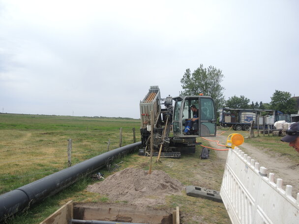 The underground installation of the protective pipes for a total of 2,100 m of new power lines was carried out in several sections under the supervision of a nature conservation company. The most delicate part was the charging borehole for the connection of the 100,000 V submarine cable in the sea through the tidal flats. Thanks to the gentle, trenchless drilling method with the GRUNDODRILL 18N, all this was possible without any impact on the protected natural environment and holiday operations.